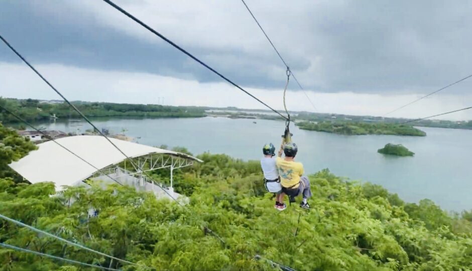 Primero, todos fueron a la tirolesa. En parejas, cruzaron entre la isla separada y el terreno principal 🌉.