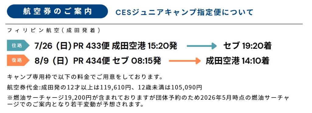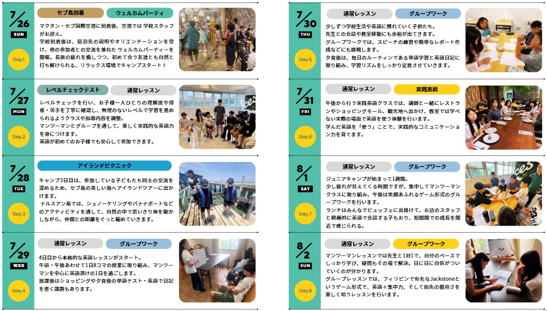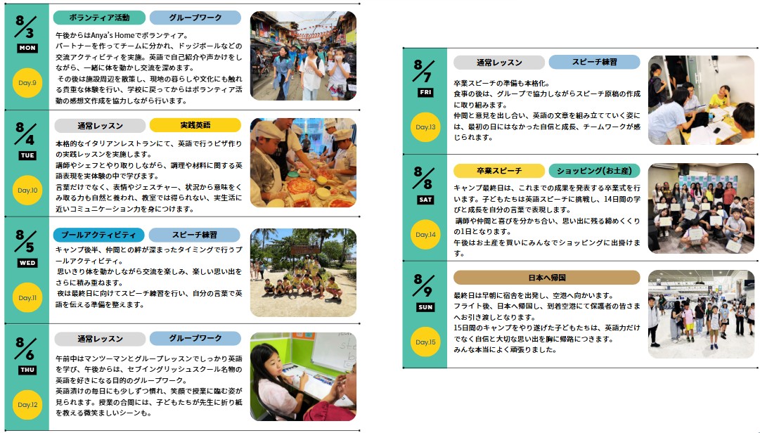 | アクティビティ | プール、アイランドピクニック、ボランティア活動、市内観光、卒業スピーチ ※キャンプ内容は申し込み状況や各施設の予約状況等により若干変更となる可能性がございます。 |