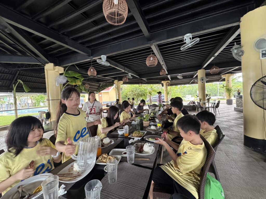 レストランでランチタイム🍽️。サンドイッチのほか、フィリピン料理(BBQ、パンシット〈焼きそば〉、イカリング、フルーツ、チキン)をみんなでシェア。新しい味にも積極的にチャレンジしました😋。