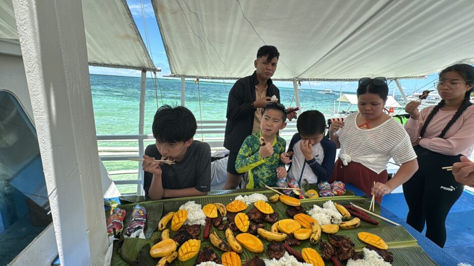 Ao chegar à Ilha Caohagan, foi hora do almoço a bordo😋. Eles experimentaram pratos filipinos diferentes do que estavam acostumados!