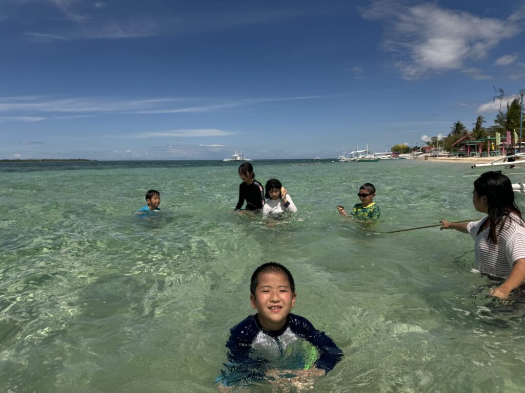 Nos passeios pelas ilhas de Cebu, é comum ter um churrasco a bordo🚤🍖, mas para as crianças foi a primeira experiência — algo que certamente ficará guardado para sempre👦👧✨🌈
