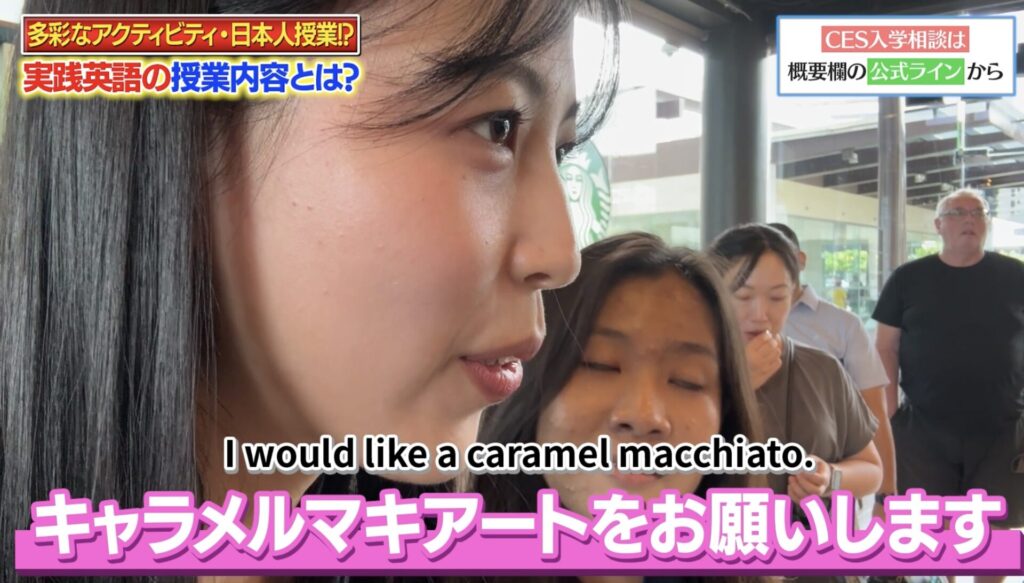 Usando o inglês aprendido, tentaram fazer seus pedidos mesmo com nervosismo, dizendo os tipos de leite e personalizações de xarope em inglês🌈.。