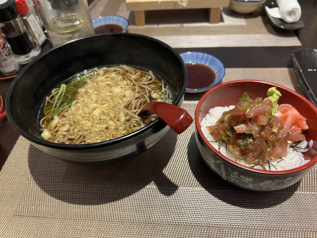 ครั้งนี้ผมสั่งเซ็ตกลางวัน “ทะนุกิโซบะ + เทคคะด้ง (ข้าวหน้ามากุโระ)” ราคา 680 เปโซ