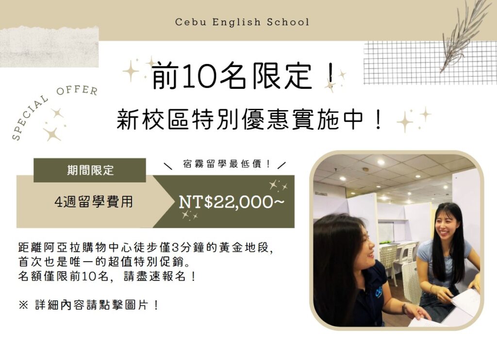 - 宿務英語學校提供內部宿舍住宿與飯店住宿兩種方案。